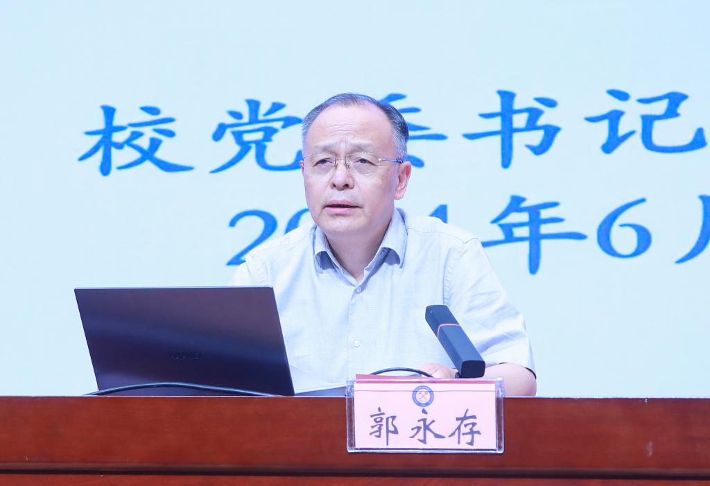 郭永存强调,开展党纪学习教育是以习近平同志为核心的党中央作出的重大决策,是加强党的纪律建设、推动全面从严治党向纵深发展的重要举措,全校上下要把《条例》学深学透学到位,做到真抓实学、学有质量、学出实效。一要深刻学习领会新修订《条例》的重要意义,全面准确理解《条例》的丰富内涵,严格执行和维护党的纪律,自觉将纪律要求内化于心、外化于行。二要全面理解和执行党的纪律,正确认识遵规守纪和担当作为的关系,做到知责于心、担责于身、履职于行,始终做到忠诚干净担当,努力创造出不负人民、不负时代的业绩。三要抓好用好以案促学、以案说纪这个重点,加强警示教育,特别是要以身边人、身边事教育引导广大党员干部知敬畏、存戒惧、守底线,主动用党规党纪校正思想和行动。四要把学习领会《条例》同学习领会习近平总书记关于全面加强党的纪律建设的重要论述相互贯通,作为党纪学习教育的重要任务,持续推动党纪学习教育走深走实、见行见效,为推动学校“双一流”创建和高质量发展营造风清气正、干事创业的良好氛围,提供坚强纪律保障!